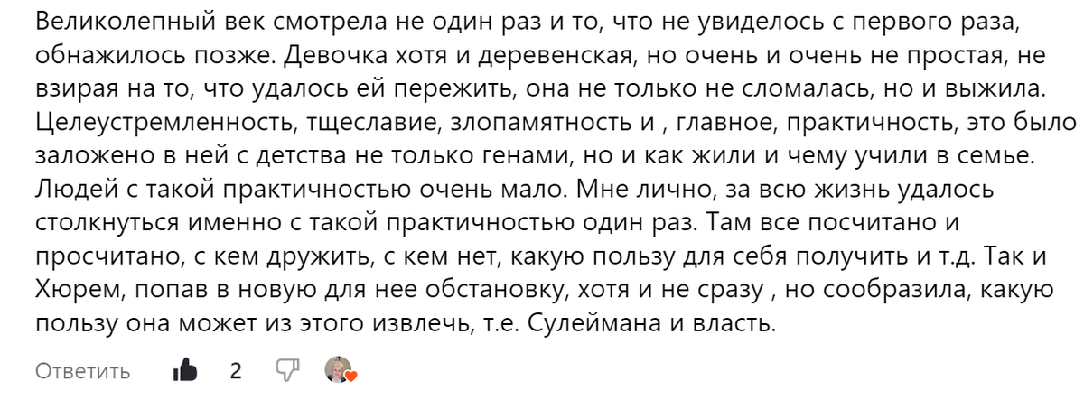 На мой взгляд, Хюррем - недобрый персонаж. Расчётливый, с холодным отношением к людям, мстительный и жестокий. Перед нами эгоистка и лицемерка. Но, когда смотрела сериал впервые, я его смотрела из-за Хюррем!😀 Была всей душой вместе с ней. И конечно же старалась мысленно оправдать любой её поступок. Так что, читая комментарии, согласна со многими, хотя и разными, мнениями.