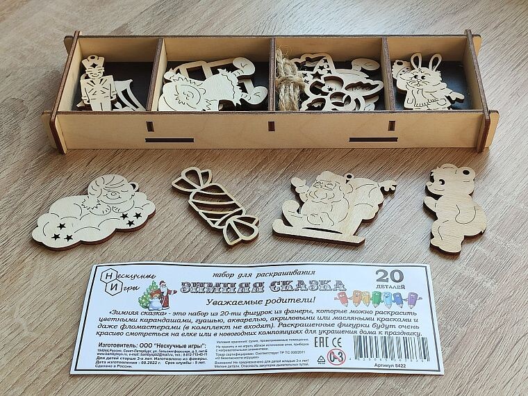 Я специально купила несколько наборов с деревянными игрушками новогодней тематики. Я надеюсь, к Новому году мы успеем раскрасить достаточное количество игрушек и сделать гирлянду для украшения дочкиной кровати – создадим новогоднее настроение.