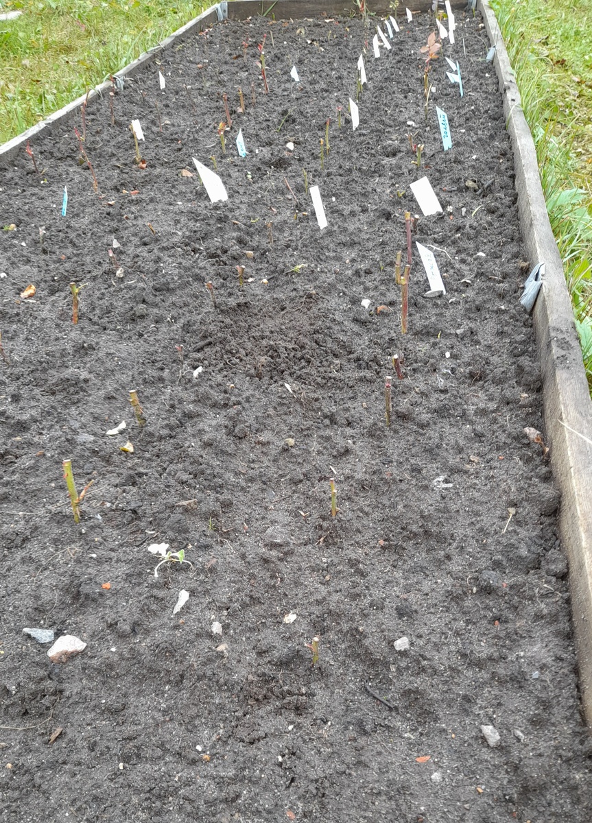 Что-то заволновалась я за свои летние укорененные черенки. Дождь – каждый день, земля уже напиталась "по уши", а он все льёт и льёт! Вся издумалась: закрывать или подождать? За розы тоже, конечно, переживаю, им сырость в зиму совсем ни к чему, но с ними ещё подождать можно до морозов. А черенки оставлять до морозов опасно, лёгкие морозцы им, конечно, тоже не страшны, уже не один пережили без последствий, а вдруг нежданно-негаданно сразу сильный ударит? Замерзнут, а виновата я буду. Решила все же укрыть. Кроме дождей, ещё и снег обещают, поберегу-ка я своих малышей. Как я собирала их по всему саду на одну грядку, можно почитать здесь: К их укрытию у меня уже все готово: пластиковые ящики (с мусорки натаскала, Магнит выбрасывает), два мешка кленовых листьев и спанбонд. Первым делом выкопала с грядки росший вместе с черенками кустик шиповника, он тут ни к чему, пойдёт на зимнюю прививку. Как я его прививала, можно почитать: Потом обрезала все листики с черенков: и старые, и молодые, высо