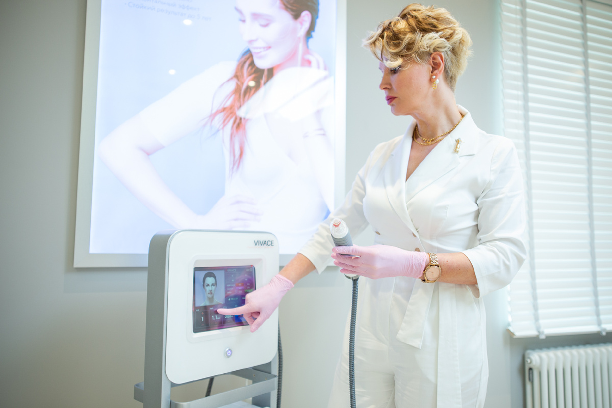 Расширенные поры — это не только эстетическая проблема, но и фактор, который способствует появлению различных дерматологических проблем, таких как акне, воспалительные реакции и даже гнойные высыпания. Поры становятся более заметными с возрастом, когда кожа теряет тонус, а устья сальных желез расширяются. Успешно справиться с расширенными порами помогают процедуры, направленные на стимуляцию выработки коллагена, который укрепляет структуру кожи, делая её более плотной и ровной. Клиника "Идеал" предлагает ряд современных методик для сужения пор и улучшения текстуры кожи. 1. RF-лифтинг Vivace Микроигольчатый RF-лифтинг Vivace — эффективный метод, воздействующий на глубокие слои кожи и стимулирующий выработку нового коллагена. Vivace использует микроиглы и радиочастотную энергию, которые проникают в кожу, вызывая контролируемое микроповреждение. Это стимулирует фибробласты к активному синтезу коллагена, что укрепляет кожные ткани и улучшает их плотность. Процессы омоложения запускаются уж