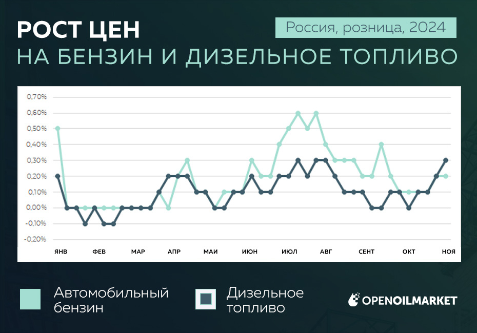 Росстат зафиксировал очередное ускорение топливных цен: на неделе с 22 по 28 октября 2024 г. цена на бензин выросли на 0,2%, а на дизельное топливо – и вовсе на 0,3%. Для сравнения: на протяжении десяти недель – с 6 августа по 14 октября 2024 г. – недельный прирост цен на ДТ не превышал 0,1%, и лишь в последние две недели цены на дизель начали серьезного ускоряться. Здесь отчасти сказывается рост спроса на межсезонное и (в некоторых регионах) зимнее дизельное топливо, производство которого существенного уступает выпуску летнего сорта дизеля. Однако важную роль играет и рост автомобильных грузоперевозок, который происходит из-за дефицита пропускной способности РЖД. По данным Росстата, грузооборот автомобильного транспорта по итогам первых девяти месяцев 2024 г. увеличился на 7,7% (год к году), а грузооборот железнодорожного – сократился на 5,3%. Дефицит пропускной способности РЖД связан не только с переориентацией экспортных потоков, но и с половинчатостью реформы железнодорожного транс