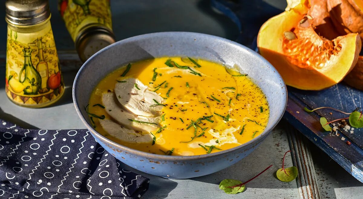 Тыквенный суп-пюре с курицей особенно приятно готовить в осенние дни, когда на улице прохладно и сыро. Почему? Во-первых, он прекрасно согревает. Во-вторых, именно осенью доступна свежая, сочная тыква нового урожая. В-третьих, суп получается питательным, так как готовится на курином бульоне и подается с кусочками курицы. Подготовьте все ингредиенты для тыквенного супа с курицей. Начните с приготовления бульона: поместите куриную грудку в большую кастрюлю, добавьте 2,5 литра холодной воды. Доведите до кипения, удалите пену шумовкой и варите на слабом огне около 20 минут. Достаньте куриную грудку из бульона. Отделите мясо от костей и нарежьте, переложите в миску, накройте и оставьте до использования. Кости верните обратно в бульон и варите еще 15 минут. Процедите готовый бульон. Нарежьте мякоть тыквы кубиками. Очистите и мелко нарежьте лук. Морковь натрите на крупной терке. Картофель очистите и нарежьте небольшими кубиками, затем поместите его в кастрюлю с холодной водой, чтобы он не пот