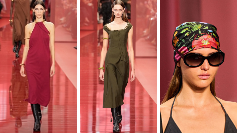Для этого показа Донателла Версаче черпала вдохновение в своей коллекции Versus весна-лето 1997. Сочетание цветочных мотивов с достаточно неподходящими для них воплощениями — кольчуге и жесткой коже — это как смешение прошлого и настоящего.