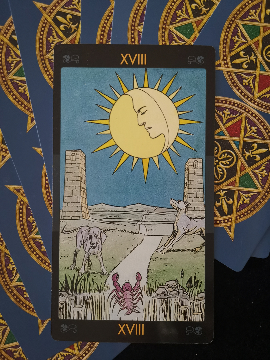 Карта "Луна" призывает нас выйти за пределы подобных ограничений, пройти через врата, символизируемые двумя башнями. Возрождение Божественной женственности позволяет нам теперь прославлять и исследовать лунные качества, долгое время считавшиеся негативными или опасными.