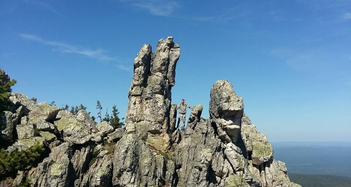 Скалы слоями торчат из земли и создается впечатление, что это крыло с перьями какой-то гигантской птицы. Ну и конечно, виды. Море тайги, уходящее волнами за горизонт, Златоуст, спрятавшийся за горами, Лбы, Митькины скалы, Откликной гребень и Круглица, выстроившиеся в ряд… Напротив, так близко и так далеко Монблан.