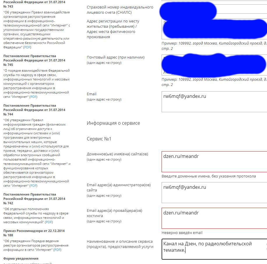 Всем доброго, вот и настал ноябрь и авторам с 10000+ подписчиками надо регистрироваться в Роскомнадзоре. Ну надо так надо! Как только я не изголялся с адресом канала, окно красное и форма не отправляется. И WWW вначале прописывал, и длинный адрес через кнопку "поделиться", и короткий, скопированный из адресной строки главной страницы канала, всё без толку. Написал письмо с просьбой разъяснить, что в эти поля вводить нужно, ответят в рабочие дни. (наверное) Как вообще они себе представляют подачу заявок от всех десятитысячников в десятидневный срок? Только у меня два сервиса которые нужно регистрировать, а сколько нас по всему миру? Как всегда - закон придумали, а исполнительные рельсы еще на складах лежат... Возможно после 10го ноября, канал "Меандр Радиолюбитель" прекратит своё существование. Надеемся на лучшее, но на всякий случай попрощаюсь. Было весело, мне будет вас не хватать! Всем пока! Всю ночь копал интернет, инструкций нет... Анатолий Иванов, спасибо за подсказку, д