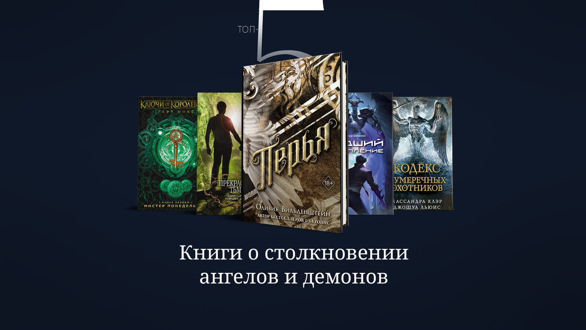 «Перья» Оливия Вильденштейн В Элизиуме ангелам предписаны строгие правила. Лей стремится изменить порядок, для чего ей нужно собрать перья и вознестись, исправив грешника. Успех даст ей статус, а провал — лишит перьев. Что может пойти не так? «Моя прекрасная тьма» Камми Гарсия, Маргарет Штоль История любви и борьбы между добром и злом, в которой юная Лена сталкивается с древними проклятиями и сверхъестественными силами. Выбор между светом и тьмой изменит её судьбу. «Падший. Искупление» Александр Шаповалов История падшего ангела Марка, скрывающего свою природу и сражающегося с темными силами в современном мире. Это философская фэнтези-сага о поиске искупления и борьбе между добром и злом, где границы часто размыты. «Сумеречные охотники» Кассандра Клэр Подросток Клэри узнает, что она — наследница древнего клана, сражающегося с демонами. Она втягивается в мир ангелов, демонов и опасных тайн, где её ждет борьба за жизнь и любовь. «Ключи к царству» Гарт Никс Подросток Артур становится владе