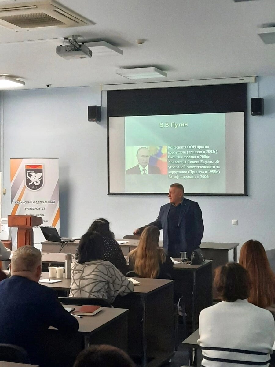 Занятия дополнительной профессиональной программы повышения квалификации для государственных гражданских служащих Республики Татарстан и муниципальных служащих в Республике Татарстан проходят в Казанском (Приволжском) федеральном университете 29-31 октября. 30 октября доктор экономических наук, профессор, Начальник Управления общественной и государственной безопасности «Академии Национальной Безопасности», Председатель Совета общественных организаций и объединений Республики Татарстан по противодействию коррупции, член Исполнительного комитета Татарстанского регионального отделения Ассоциации юристов России, член совета ТРО ВООВ «Боевое Братство», врио ректора «Татарского института переподготовки кадров агробизнеса», генерал-майор Алексеев Сергей Львович провёл лекцию на тему юридической и морально-нравственной ответственности за коррупционное поведение. Он рассказал об исторических аспектах возникновения коррупции как социально-негативного явления, государственной и региональной по