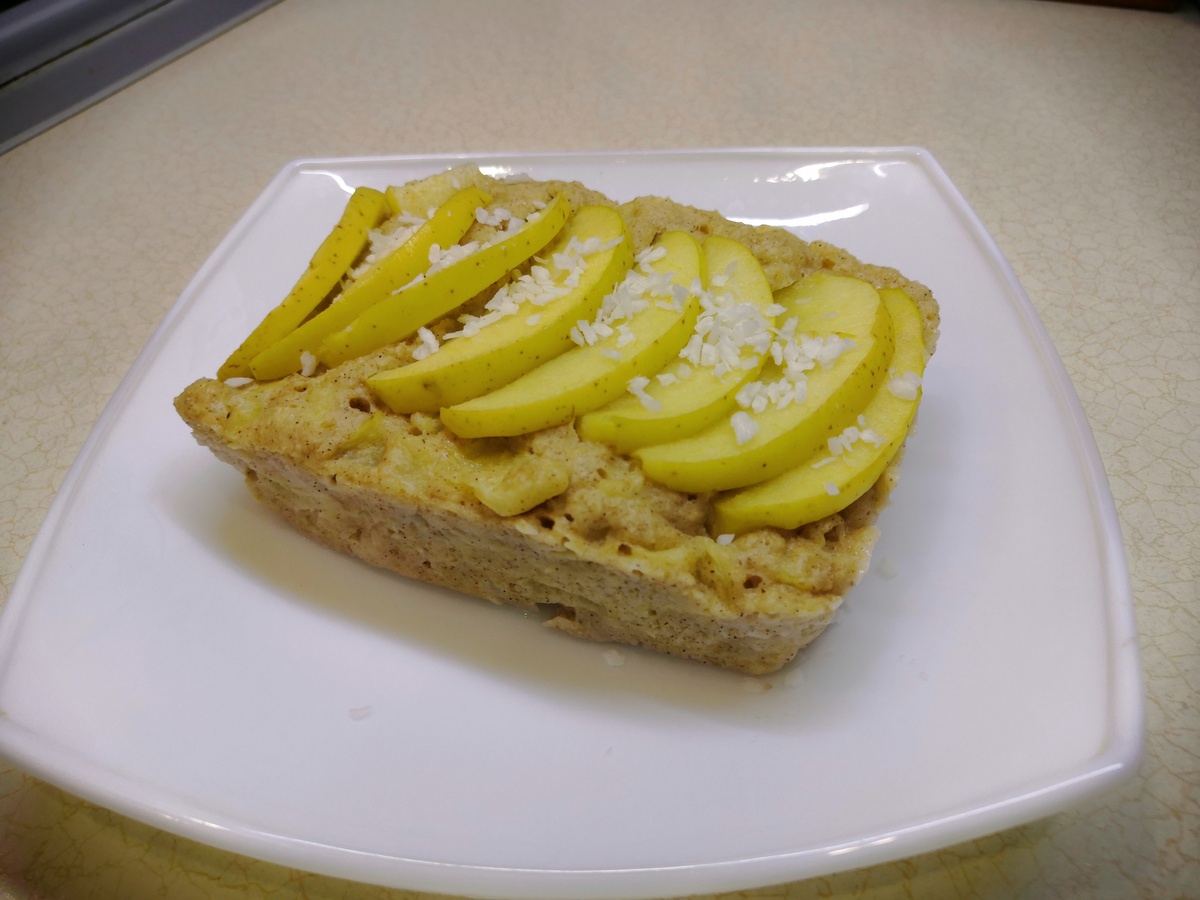 3. Переложила тесто в формочку для микроволновки. Сверху выложила яблоки слайсами. Запекала 4 минуты. Мощность моей микроволновки - 700. Украсила кокосовой стружкой