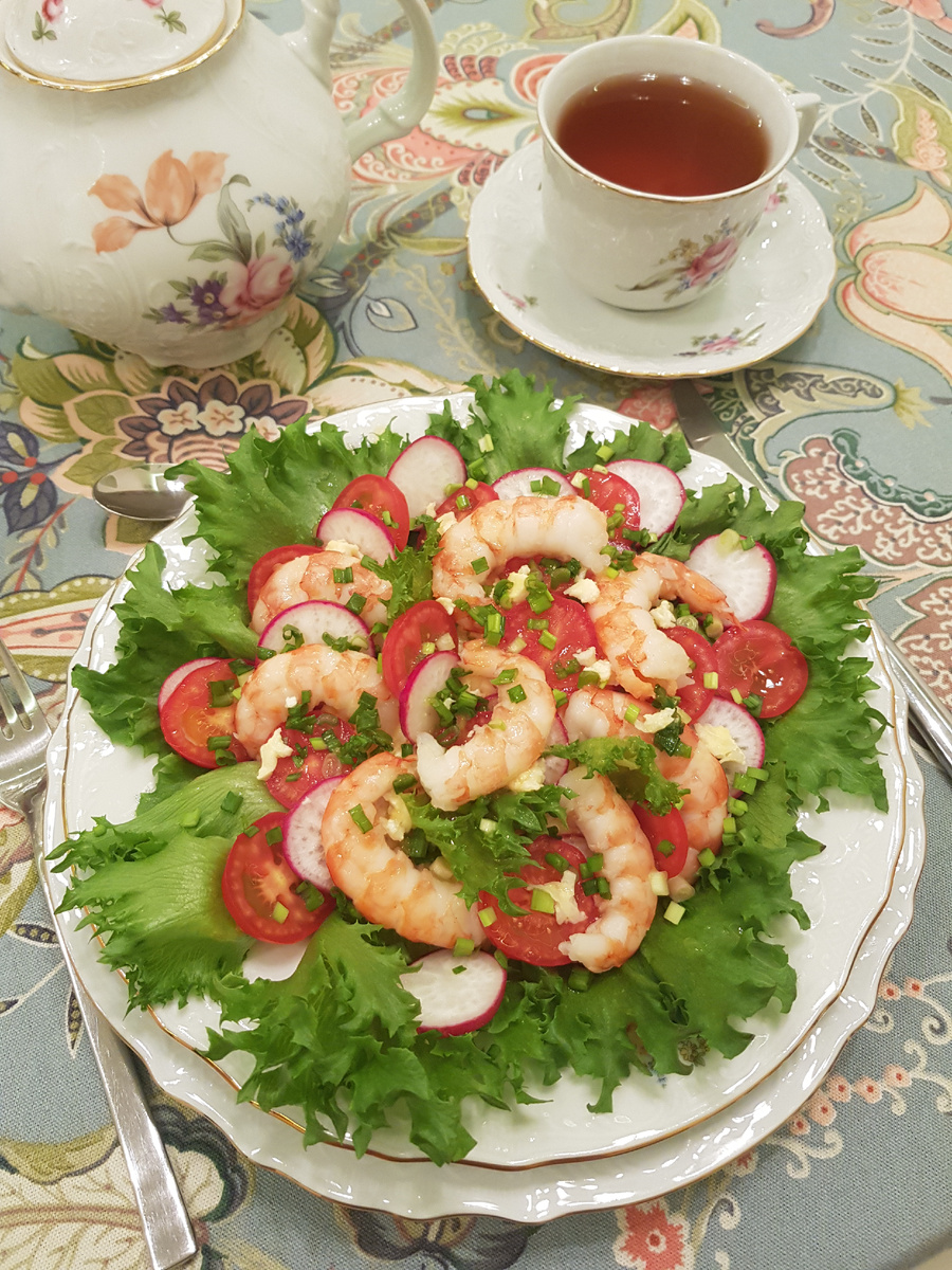 Добрый день, дорогие друзья! Сегодня я представляю вашему вниманию в меру легкий и в меру питательный салат, который может стать украшением и праздничного осеннего стола, или разнообразить семейный ужин. Для приготовления нам понадобятся: 400 грамм креветок, 8 помидорок черри, 6 редисок, 4 веточки зеленого лука, листья салата, 1 апельсин, 2 яйца, 80 грамм сыра, 80 грамм молока, 1/2 чайной ложки соли, 1 столовая ложка масла из виноградных косточек. Приготовление: сыр натереть на мелкой терке. Смешать с помощью вилки яйца, молоко, щепотку соли. Добавить в омлет сыр. Смазать горячую сковородку растительным маслом и вылить омлетную смесь, уменьшить огонь до среднего уровня, накрыть крышкой и готовить 8 минут. В кипящую подсоленную воду опустить креветки на 2 минуты. Через 2 минуты креветки достать из воды и положить на лед, после этого они быстро остынут и будут легко чиститься. Очистить креветки, удаляя панцирь и пищевод. Нарезать кружками редис. Нарезать кружками томаты. Нарезать