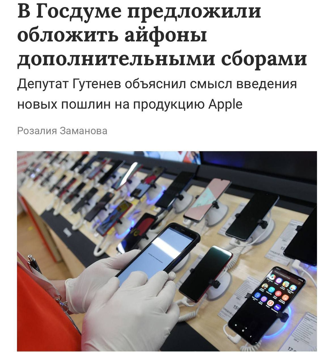 В Госдуме предложили обложить всю технику Apple дополнительными пошлинами и сборами. Их могут ввести из-за отказа в установке российских приложений. Если компания не пойдёт на это условие, то депутаты рассмотрят законопроект уже в ноябре