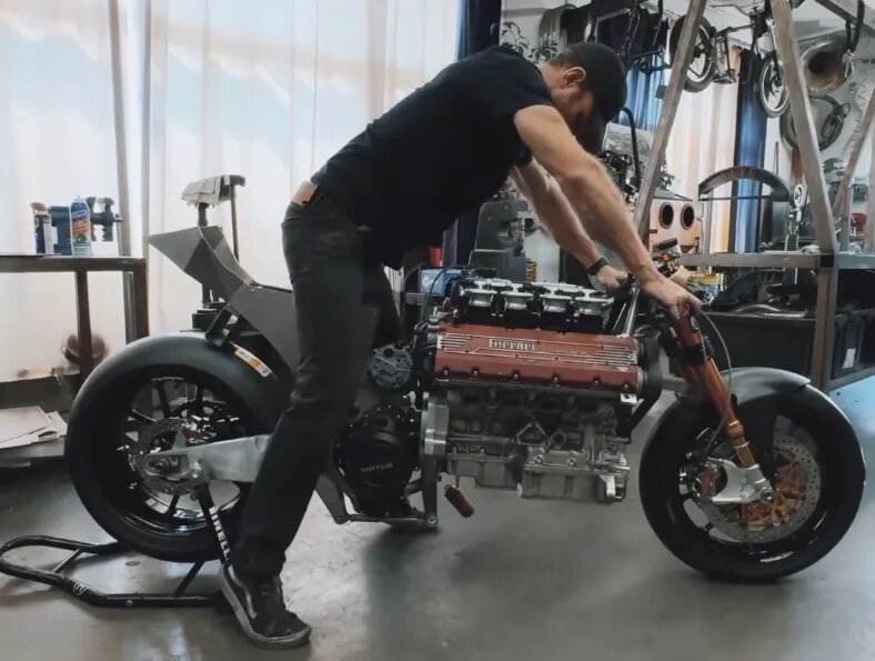 Максвелл Хейзен (Maxwell Hazen) поделился ходом работ над своим последним кастом-байком: он собрался установить двигатель V8 от Ferrari F355 в изготовленную на заказ раму. Так что это может быть не «настоящий» Ferrari V12, хотя с точки зрения логистики это неразумный путь, учитывая физический размер двигателя — просто никто не сказал об этом Аллену Миллиарду, когда он строил свой мотоцикл V10 Viper с двигателем Dodge! Тем не менее, двигатель F355 очень почитаем в кругах любителей Ferrari: он имеет объем 3 495 куб. см, развивает мощность более 370 л.с. и даже оснащен коленвалом с плоской плоскостью.