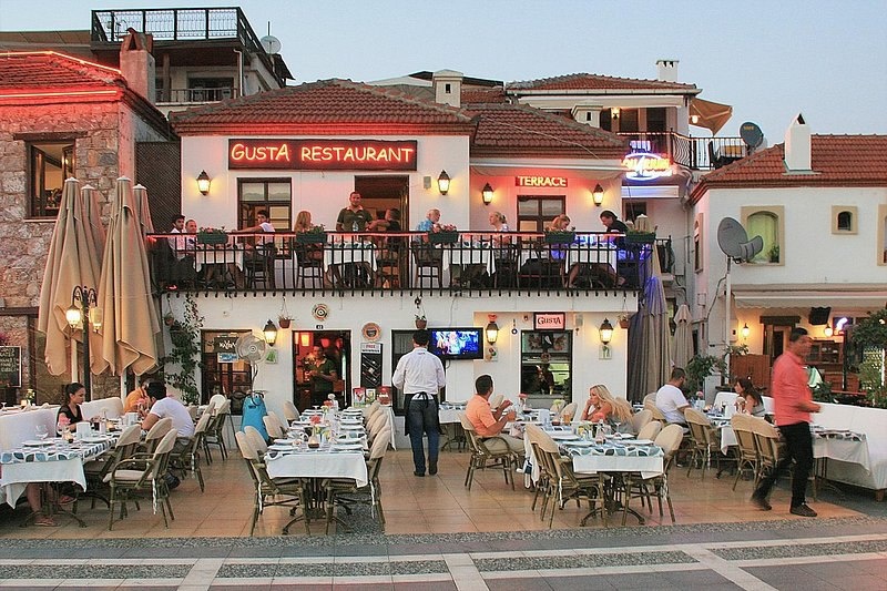 Отдыхая у моря, люблю кушать побольше морепродуктов. Хотелось найти что-то местное, вкусное, с красивым видом и приятной атмосферой. Посоветовали сходить в один ресторанчик и я не пожалела. Он сам небольшой, но есть второй этаж с террасой, с которой открывается потрясающий вид на море и город. Ресторан пользуется популярностью, советуют бронировать, но мы попали без записи. На террасе все столики были заняты и поэтому нас разместили на первом этаже. В ресторане играет приятная музыка, иногда даже русская. Если вы не знаете английского или турецкого, не переживайте, у них есть прекрасная русскоговорящая Анна, которая всё вам подскажет и посоветует. Мы взяли креветки в соусе с грибами (подаются с рисом), ассорти морепродуктов, в котором были мидии, осьминог, креветки, два вида рыбы, салат с зеленью, медом и яблоками, бутылочку белого вина и на десерт тирамису. Именно Анна посоветовала нам к морепродуктам этот легкий необычный салат и вино, и это оказалось потрясающим сочетанием вкусо