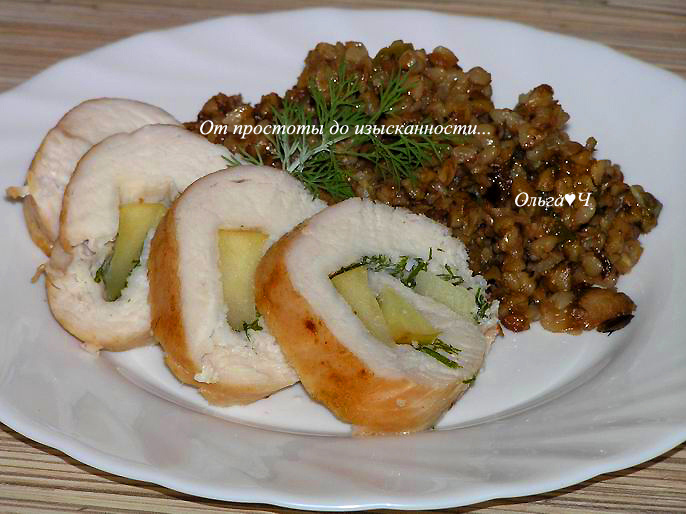 растительное масло для жарки Приготовление: Куриную грудку разрежьте вдоль не до конца, разверните "книжечкой", немного отбейте. Посолите, поперчите, положите веточки укропа. Добавьте дольки яблока. Сверните в рулет, обвяжите ниткой или закрепите шпажками. Обжарьте рулет на растительном масле со всех сторон до румяности, затем потушите минут 5, если сомневаетесь в готовности. Нарежьте кружочками и подавайте с любым гарниром, у меня сегодня гречка. Приятного аппетита! Вам также могут понравиться: