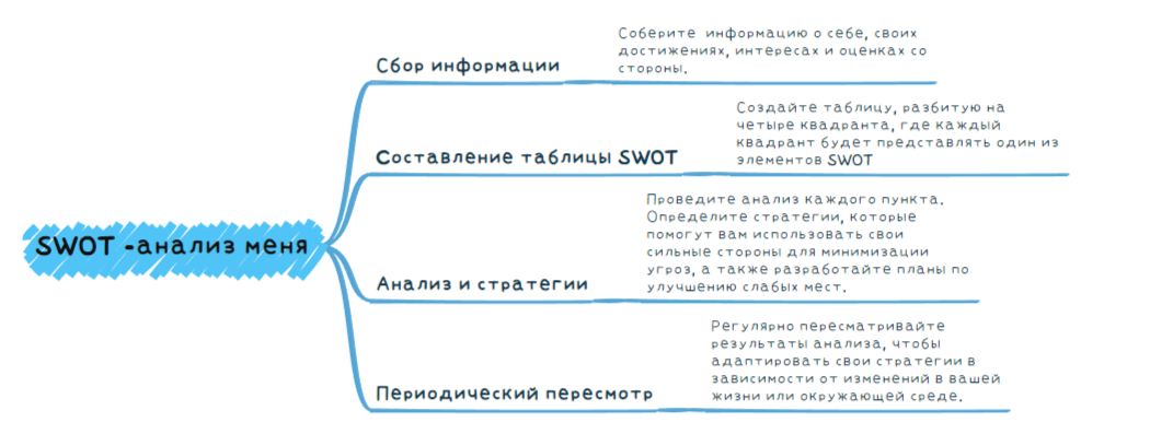 Думаю, вы слышали что-то про SWOT-анализ. SWOT-анализ (Strengths, Weaknesses, Opportunities, Threats) — это метод стратегического планирования, который обычно применяется для оценки бизнеса и организаций. Но его с успехом можно использовать для личных целей. SWOT-анализ помогает людям лучше понять свои сильные и слабые стороны, а также возможности и угрозы, которые могут повлиять на их жизнь и карьеру. Польза SWOT анализа для личности Самоосознание: Анализ своих сильных и слабых сторон позволяет человеку получить более ясное представление о своих способностях и недостатках. Определение целей: Понимание возможностей и угроз может помочь в формировании жизненных целей. Человек сможет сфокусироваться на тех областях, которые способствуют его успеху, и избегать тех, которые приводят к неудачам. Планирование развития: На основе анализа можно разработать четкий план по развитию своих сильных сторон и устранению слабостей. Управление рисками: Осознание угроз, существующих в личной и профессио