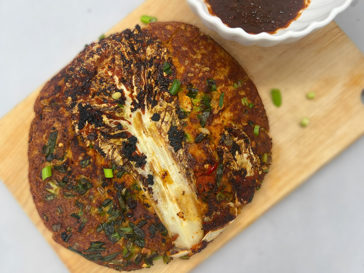 Мне нечего сказать об этом рецепте, кроме того, что это вариация омлета, в котором присутствует капуста кимчи и кале для удержания формы. Я так себе блогер, но вы просто попробуйте этот омлет! Количество: 2 порции Ингредиенты: Для блинов Для соуса, или можете заменить острым соевым соусом Инструкция: 1. Смешайте яблочный уксус с растительным молоком и отставьте в сторону. В большой миске взбейте венчиком или вилкой все сухие ингредиенты (мука, разрыхлитель, крахмал, сода, соль, чесночный и луковый порошок). 2. Добавьте к сухим ингредиентам измельченный чеснок (1/2 части чеснока измельчите, а другую половину нарежьте тонкими ломтиками, которые вы сохраните для "начинки"), половину измельченного зеленого лука, 1 перец чили. 3. Добавьте половину измельченного ножницами кимчи, а также 1-2 чайные ложки сока кимчи. 4. Добавьте растительное молоко и взбивайте, пока сухие ингредиенты не будут полностью перемешаны. Тесто получится очень густым (почти как для торта), но если оно слишком густое,