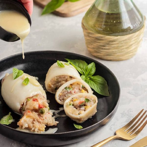 - Кальмары промыть, если надо — почистить и вынуть хитиновые пластинки. Обдать кипятком (выложить в миску и залить кипятком на 15-30 секунд).
