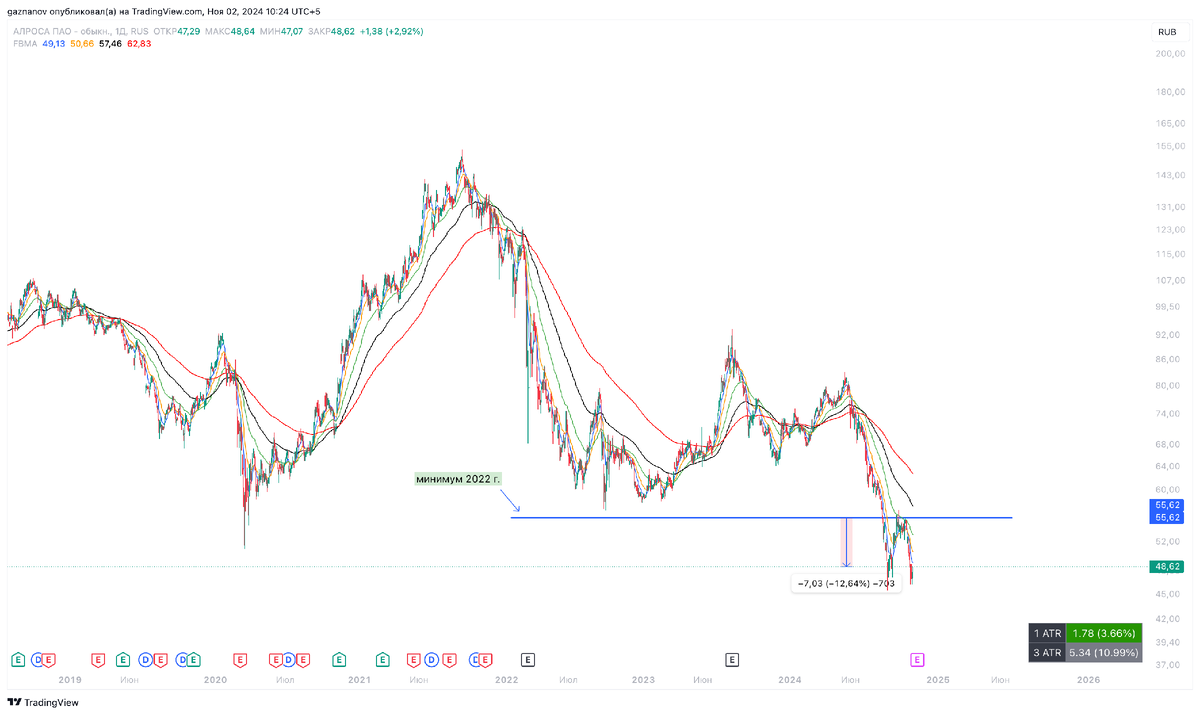 Акции $ALRS обновили свой минимум от 2022 года и это ТОТ САМЫЙ минимум про который говорили чуть ли не все, что просто нельзя было на нем не купить, что все НАСТОЛЬКО дешево, что надо быть идиотом, чтобы проигнорировать эту золотую возможность, которая являлась подарком для всех долгосрочников, которые начали свой богатый отсчет от этого дна. А так же для тех, кто только собрался войти в эту индустрию. Акции растут благодаря тем, кто покупает дороже и падают благодаря тем, кто готов продавать дешевле. Первые убеждены, что смогут продать дороже, а вторые убеждены, что смогут купить дешевле. Кого больше, тот и победил. На данный момент, спустя 2 года, цена на эти акции ниже на 10% от ТОГО САМОГО минимума. За ДВА года -10%: $SMLT показывает от минимума 2022 г. -20%: Это самые очевидные примеры. Какие-то акции подбираются к своему ТОМУ САМОМУ минимуму, другие акции в принципе остановились в росте и их тоже постигнет эта участь. Было/есть несколько лидеров, по типу $BSPB, $POSI, $AFLT, кото