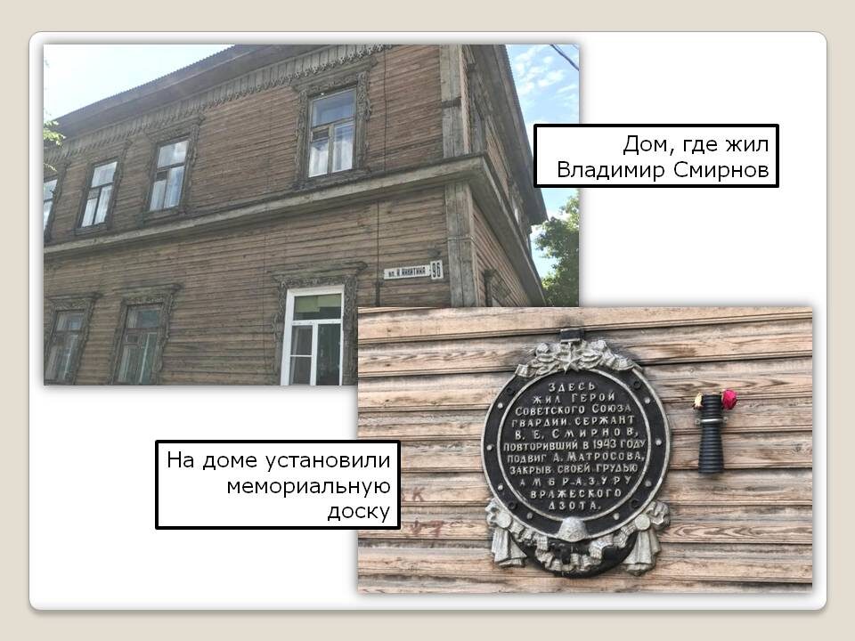 «До чего же велика была сила воли в этом молодом человеке, до чего яростна ненависть к врагам Родины, что, умирая, Владимир Смирнов, стоя уже на коленях, разрядил полностью магазин автомата до последнего патрона, до последней капли крови сражался за Отчизну»