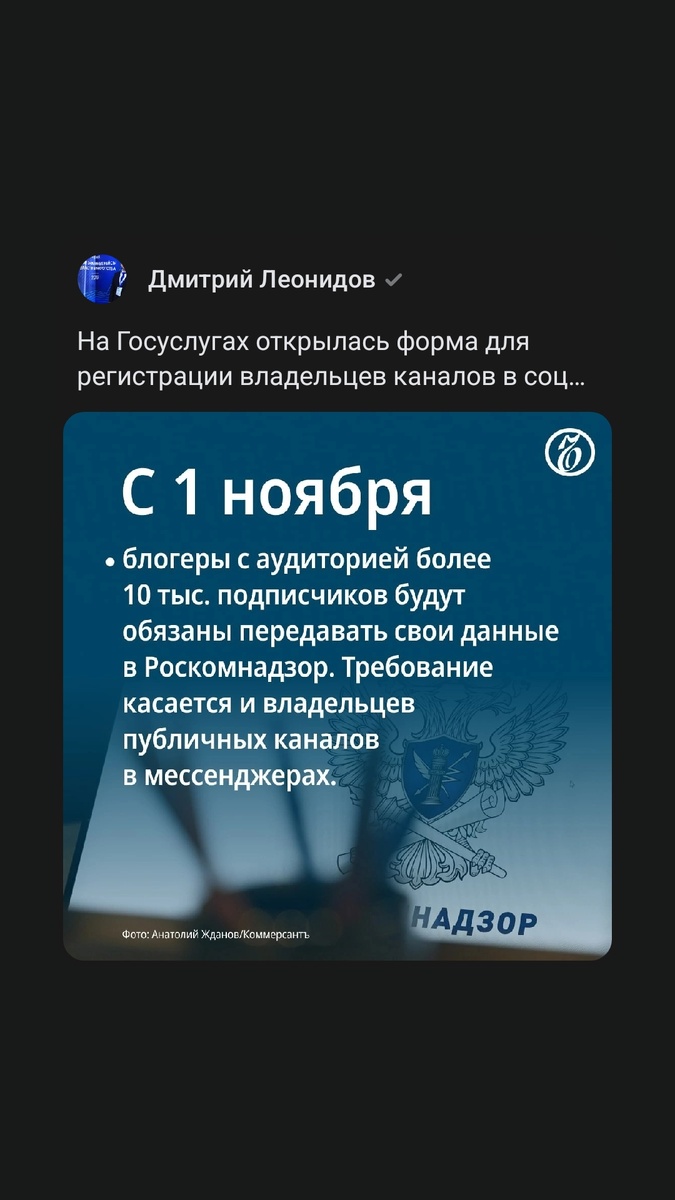 В Минцифры сообщили: после добровольной идентификации каналы будут включаться Роскомнадзором в специальный перечень. РКН примет решение о добавлении страницы в перечень в течение 10 рабочих дней. После включения в реестр владелец канала должен разместить в его описании уникальную ссылку на запись о своем паблике из этого реестра. Если канал или страница не будут включены в перечень, рекламодатели не смогут размещать в них рекламу, а другие каналы не смогут репостить их сообщения. Эти ограничения вступят в силу с 1 января 2025 года. ▪Подписывайтесь на «Ъ»|Оставляйте «бусты»