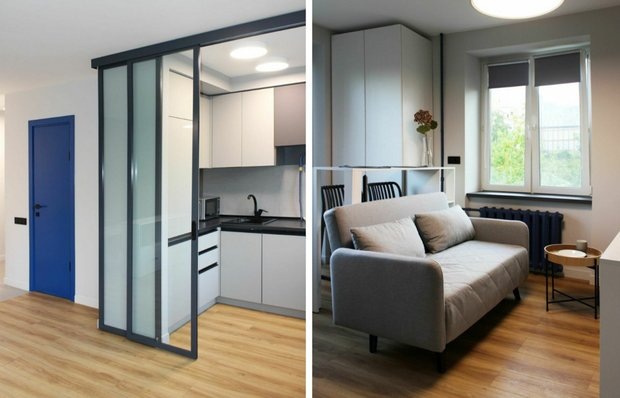Бюджет: 1,5 млн рублей На момент покупки квартира была в черновой отделке — стены и потолок оштукатурены, выполнены стяжка пола и разводка электрики. Перепланировка также была проведена предыдущими владельцами. Из типовой однушки они сделали квартиру-студию: демонтировали стену между кухней и гостиной, а