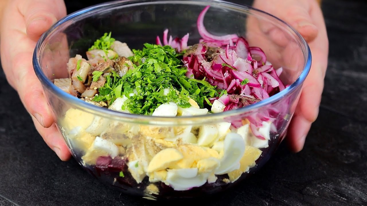 САЛАТ С СЕЛЬДЬЮ Ингредиенты: Отварная свекла - 500 гр. Сельдь - 1 шт. Отварные яйца - 3 шт. Красный лук - 1 шт. Растительное масло - 3 ст. л. Зелень петрушки Соль - ½ ч. л. Сахар - 1 ст. л. Яблочный уксус - 3 ст. л. Приготовление: Одну небольшую луковицу нарезаю перьями. Отправляю лук в отдельную чашу, заливаю кипятком, добавляю: соль, сахар, уксус и оставляю мариноваться. Сельдь отделяю от кости, снимаю кожу. Филе сельди нарезаю небольшими кусочками и отправляю в глубокий салатник. Отварную свеклу, нарезаю брусочками небольшого размера. Яйца нарезаю полукольцами. Нарезанные ингредиенты отправляю к сельди. Сюда же добавляю мелко нарезанную петрушку и маринованный лук. Салат немного солю, перчу по вкусу, заправляю небольшим количеством растительного масла, перемешиваю и можно подавать. Приятного аппетита!