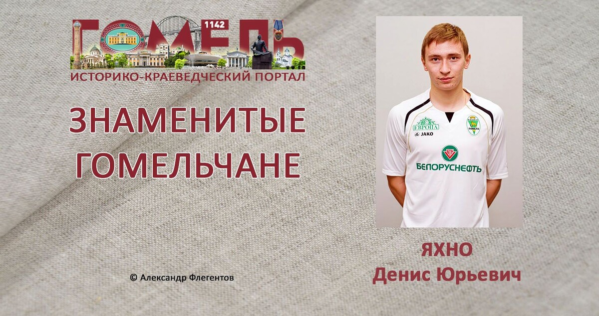 Денис Юрьевич Яхно (20.11.1992, Гомель) — белорусский футболист, нападающий. Воспитанник гомельского футбола, первый тренер — Валерий Потапович Яночкин, который ныне работает старшим тренером ФК «Гомель». В 2006—2008 годах играл за различные юношеские команды ФК «Гомель». В 2009 году, в возрасте 16 лет, начал играть за резервную команду клуба. Осенью 2009 года выпустился из центра подготовки резерва при ФК «Гомель» и 17 ноября 2009 года заключил трёхлетний профессиональный контракт с клубом. Дебютировал за ФК «Гомель» 1 мая 2010 года в матче Первой Лиги против «Полоцка», выйдя на замену на 6 минут. В сезоне 2010 года поучаствовал ещё в 4 матчах, во всех появлялся в игре с замены. В 2011 и 2012 году играл за резервный состав «Гомеля», за два года сыграв в первенстве дублеров 47 игр, забив при этом 13 мячей и отдав 8 голевых передач. В 2012 году стал вместе с партнерами по команде победителем турнира дублирующих составов. В конце 2012 года перенес операцию на паховых кольцах,