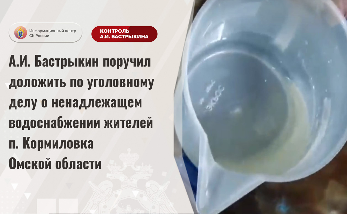 А.И. Бастрыкин поручил доложить по уголовному делу о ненадлежащем водоснабжении жителей п. Кормиловка Омской области В комментариях в аккаунте приёмной Председателя СК России А.И. Бастрыкина «ВКонтакте» сообщается о продолжающемся нарушении прав жителей поселка Кормиловка Омской области. Длительное время в домовладения граждан поступает вода с ржавчиной и иными примесями, непригодная для потребления. В прошлом году в рамках реализации федерального проекта «Чистая вода» введена в эксплуатацию локальная станция очистки, однако ее производительность недостаточна для обслуживания населенного пункта. Неоднократные обращения в различные структуры результатов не принесли. Ранее указанная ситуация освещалась в СМИ. А.И. Бастрыкин поручал представить по ней доклад. В СУ СК России по Омской области расследовалось уголовное дело, которое прекращено. Председатель Следственного комитета Российской Федерации Александр Иванович Бастрыкин поручил руководителю СУ СК России по Омской области Виталию Вл