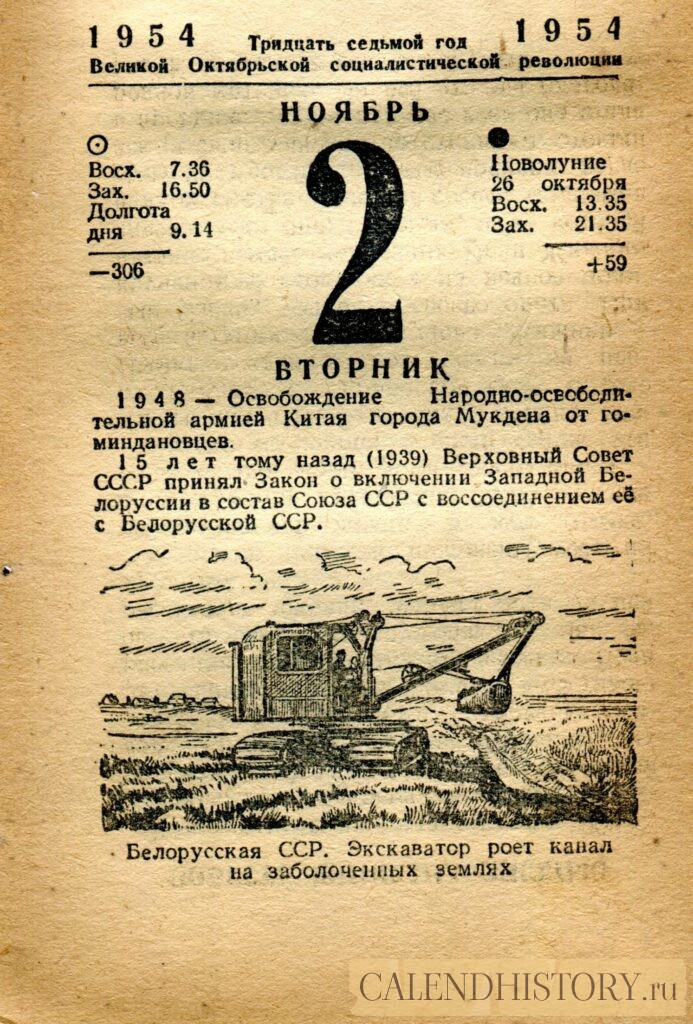 Итак, сегодня 2-го ноября и у нас на календаре 1954-й год. Перед нами листок советского календаря Политиздата. Белорусская ССР. Экскаватор роет канал на заболоченных землях 1948 — Освобождение Народно-освободительной армией Китая города Мукдена от гоминдановцев. 15 лет тому назад (1939) Верховный Совет СССР принял Закон о включении Западной Белоруссии в состав Союза ССР с воссоединением её с Белорусской ССР. Оборотную сторону листка этого календаря можно посмотреть у нас по ссылке на сайте. Другие листки советских календарей смотрите у нас на сайте - CALENDHISTORY.ru