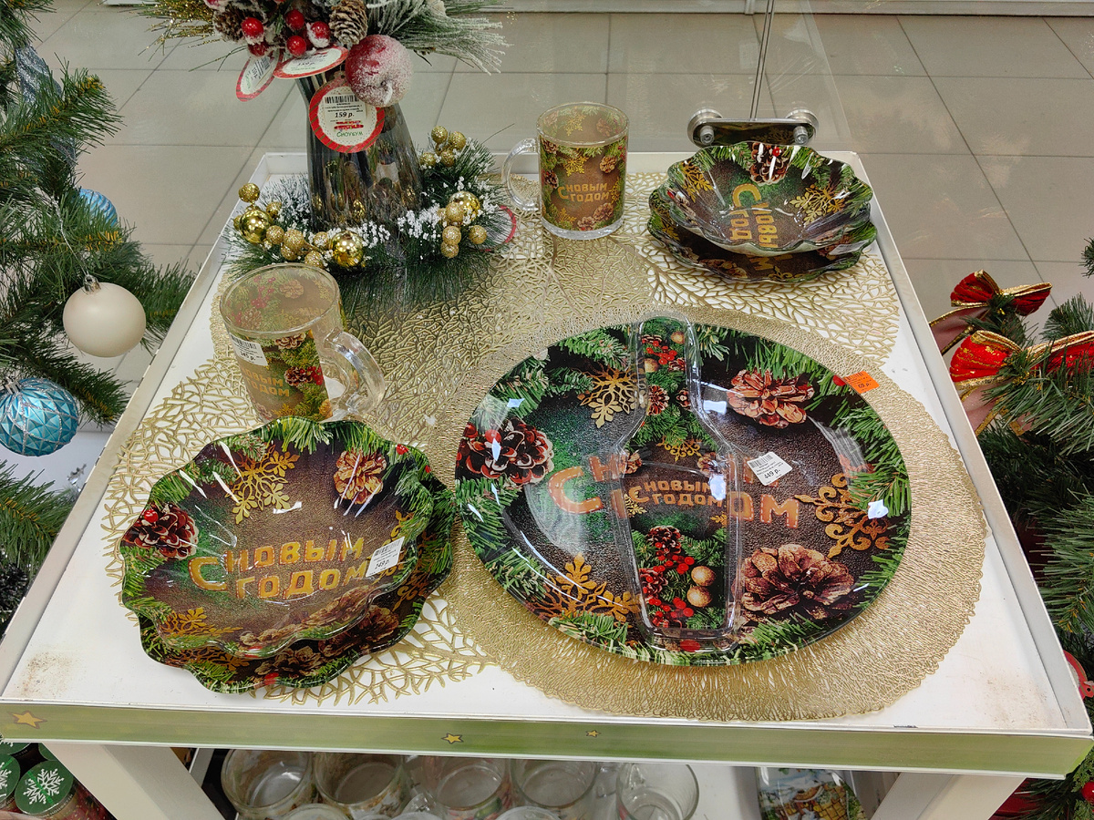 Для встречи Нового года появились стеклянные тарелки с надписью и сосновыми веточками, шишками. Все предметы продаются отдельно, в целом получается комплект, включая салатники разного размера с волнистыми краями, обеденную тарелку, подставку под ложку, кружку.