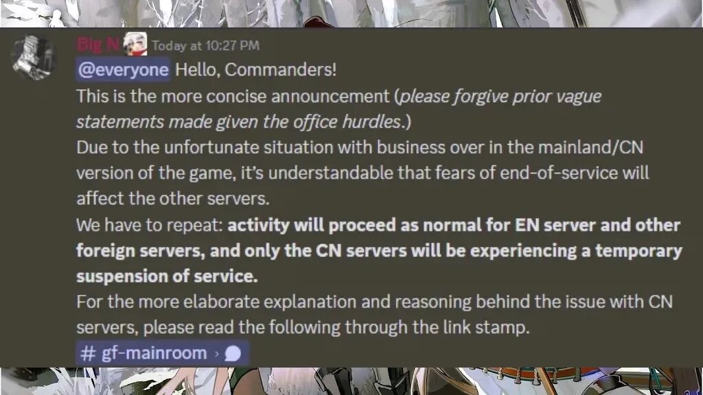 Разработчики Girls' Frontline сообщили о том, что их мобильная игра будет закрыта 31 декабря текущего года. В данный момент речь идет исключительно о китайской версии проекта, но в будущем, после глобального релиза второй части, аналогичные меры вполне могут быть приняты и по отношению к Girls’ Frontline для других регионов. Но для игроков с китайского сервера есть и хорошая новость. Игра закрывается, но не навсегда. Разработчики уже обозначили, что когда-то в будущем проект будет вновь запущен и, вероятно, пользовательские данные не будут затронуты. Причиной этого временного закрытия серверов, судя по всему, становится завершение контракта с издателем (или лицензиатом) игры на территории Китая. Сроки возвращения китайской версии в онлайн остаются неизвестными.