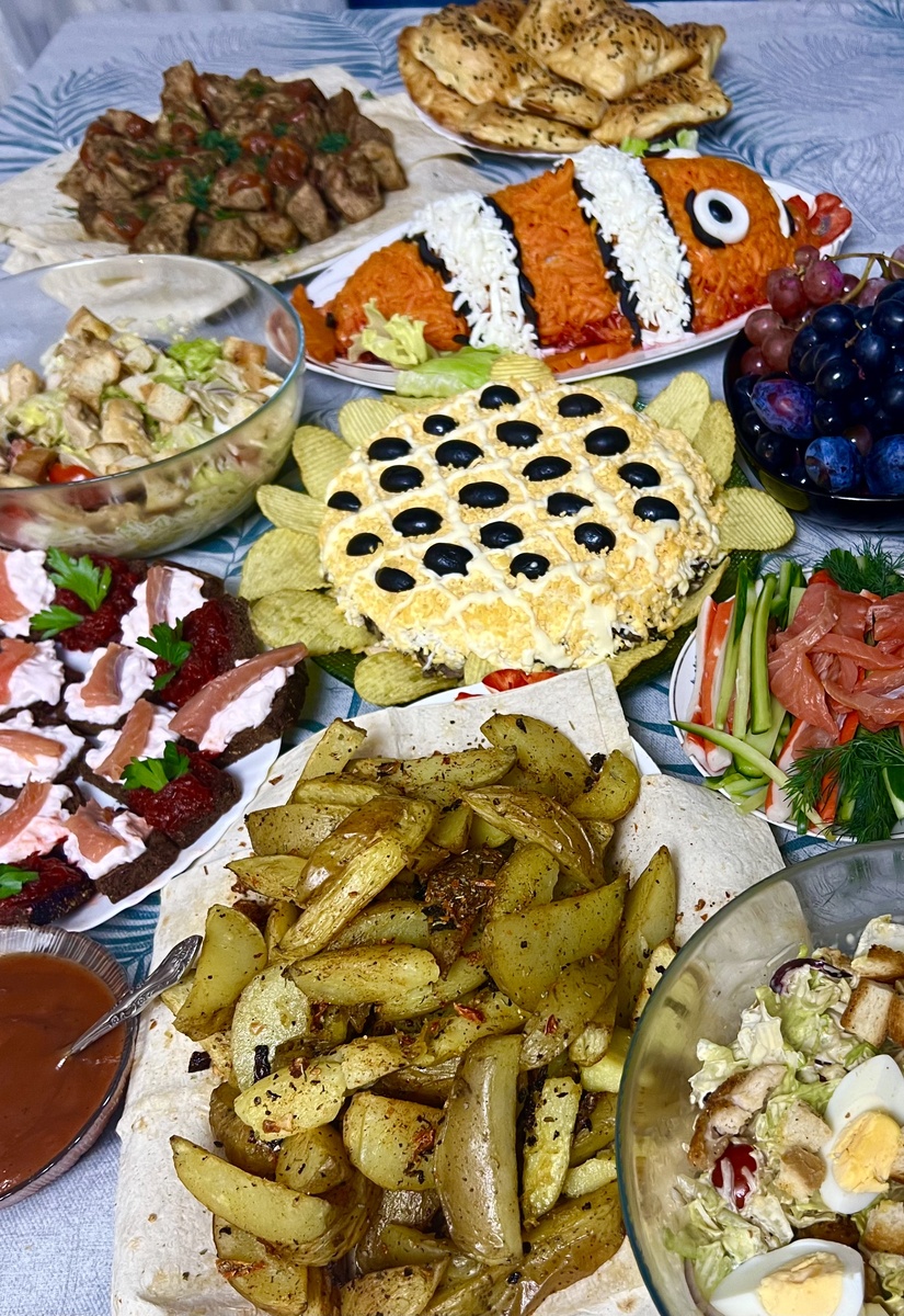 День рождения ребёнка — отличный повод проявить фантазию и удивить маленьких гостей не только вкусом, но и ярким оформлением угощений. Моему сыну исполнилось 8 лет, и я постаралась приготовить именно те блюда, которые он особенно любит. В этот день мы собирались в кругу нашей большой семьи, поэтому все блюда домашние и простые, но очень вкусные!