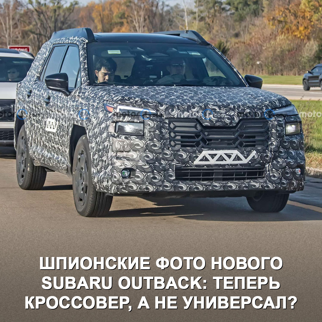 На шпионские фото попался тестовый прототип автомобиля в камуфляже. У него увеличенный передок с квадратными формами, крупная решётка радиатора и двухэтажная оптика по последней моде с узкими фарами. Угловатые боковые окна над багажником напоминают таковые у Outback второго поколения, но сам силуэт машины стал выше и массивнее. Теперь это скорее кроссовер, а не универсал.
