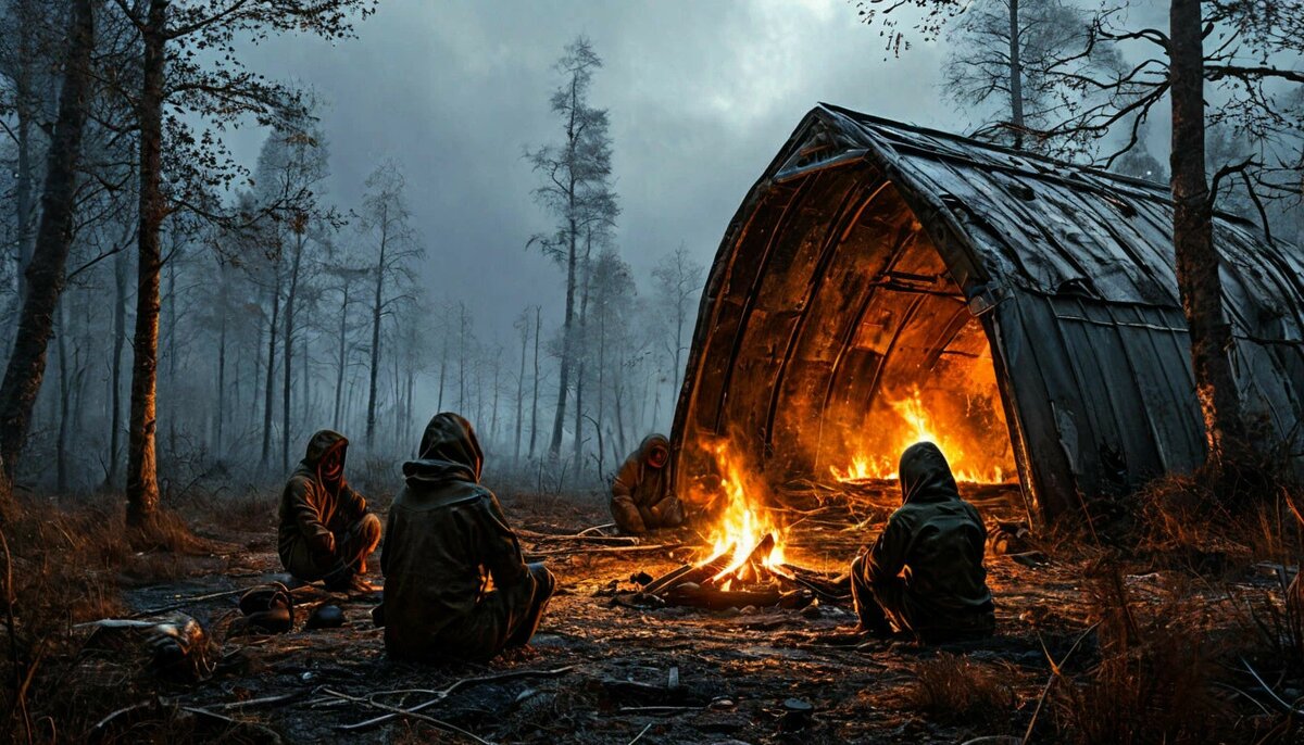 Подходя к ангару, я рассуждал на камеру о том, почему раньше вокруг Барнаула было так много военных частей, а теперь их передислоцируют в другие города. Не заметил, как уже подошёл к входу и увидел, как мне показалось, группу военных. Люди в форме сидели у костра и общались между собой.