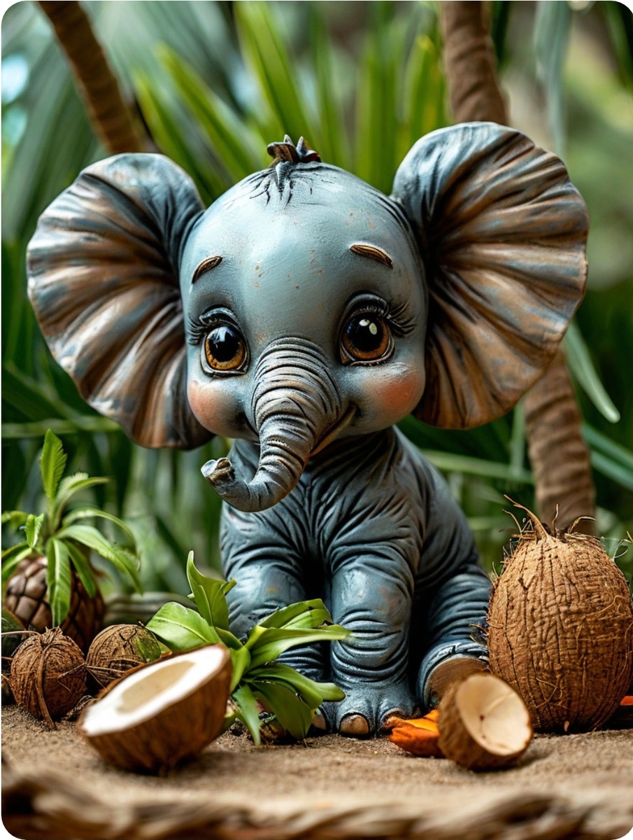 Жил-был в тропическом лесу маленький слоненок по имени Бамбук. Он был самым любопытным и озорным среди всех своих друзей. Однажды утром он решил отправиться на прогулку по джунглям, чтобы найти что-нибудь интересное. Пройдя немного, Бамбук наткнулся на старую кокосовую пальму. На вершине дерева висели огромные кокосы, но добраться до них было непросто. Слоненок задумался: «Как же мне достать эти вкусные плоды?» Вдруг ему пришла в голову идея! Бамбук подошел к дереву и начал толкать его своим массивным хоботом. Пальма начала наклоняться, и через несколько минут первый кокос упал прямо перед ним! Слонёнок радостно схватил плод и принялся жевать сочную мякоть. Но тут случилось неожиданное – второй кокос, упав с дерева, попал прямо в заднюю часть Бамбука! Слоник взвизгнул от удивления и побежал прочь, а за ним покатились ещё несколько кокосов. Один из них угодил в ствол дерева, другой – в кусты, третий – в воду, создавая целую цепочку забавных событий. В этот момент мимо проходил стар