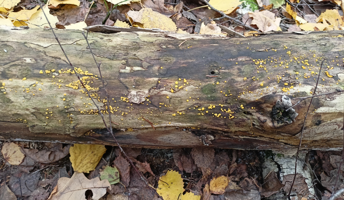 Как уже наверное заметил Читатель, путешествие по осеннему Лесу дарит очень много грибных встреч. Крупные, маленькие, грунтовые, древесные, всех мыслимых цветов грибы встречаются через каждые несколько шагов. Всё, что нужно для грибного изобилия - это влага. А осень, это время, когда утренние туманы с успехом заменяют дождь. Время от времени на нашем пути встречаются лежащие на земле древесные стволы, уже потемневшие от времени. И на тёмном фоне яркими россыпями светятся маленькие точечки, то рассыпаясь будто настоящие звёзды по небосклону, то собираясь так плотно, что образуют одно яркое жёлтое пятно. Давайте же рассмотрим их немного поближе. Эти маленькие точечки - тоже грибы. В научной литературе называют этот вид Биспорелла Лимонная, или Bisporella Citrina. В англоязычной литературе можно встретить другие, более романтичные названия : Жёлтая Чашка Фей, и Лимонные Диски. И чашечка и диск по отношению к грибу относятся верно. Дело в том, что в молодом возрасте, едва появ