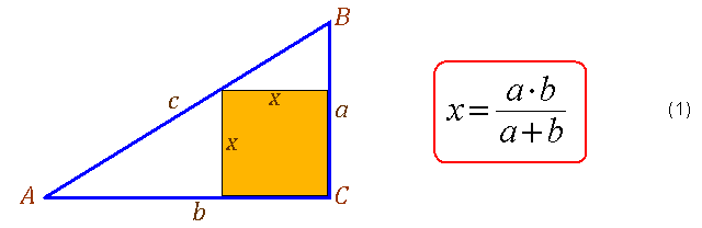 Задача о вписанных квадратах в двух вариантах (частном и общем) была предложена для обобщения формулы длины стороны x квадрата, вписанного в прямоугольный треугольник с катетами a и b (эта формула упоминалась как полезный инструмент при решении некоторых геометрических задач в ряде выпусков канала «Наглядная геометрия»): Подробные решения предложенных частной и общей задач именно в такой последовательности представила одна из читательниц. Теперь, подводя итоги, я сделаю всё в обратном порядке: сначала получу общую формулу для длины стороны вписанного квадрата, затем с её помощью решу общую задачу и, наконец, частную. Пусть у нас имеется произвольный треугольник, на одной из сторон которого можно построить вписанный квадрат. Нам известны длина этой стороны - b и опущенная на неё высота– h (см. рисунок). Воспользовавшись подобием треугольников ABC и A’BC’, запишем пропорцию между их сторонами и высотами, из которой сразу получается простая формула для длины стороны вписанного квадрата. Э