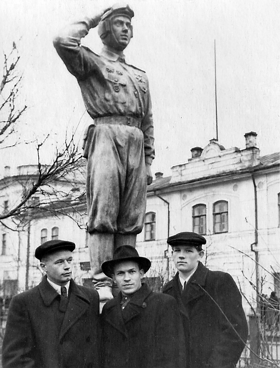Начало современной улицы Мира в середине 1950-х. В те годы это ещё улица Сталина. Слева немного выглядывает Ярмарочный дом, где находится пролом на Старый рынок. Когда точно скульптуру установили и когда демонтировали - не совсем понятно. Этот военный стоял в начале бульвара, а с другой его стороны была скульптура ещё одного военного уже у перекрёстка с современной Козлёнской улицей. Подобных скульптур по городу в те годы было немало. Нынче опять пошёл бум на установку скульптур и памятников, порой совершенно непонятных и не к месту.