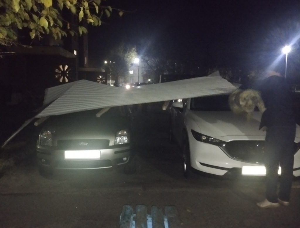 Срыв одного листа металлопрофильной облицовки торцевой части фасада жилого дома в г. Калинковичи по ул. Первомайской. В результате которого повреждены два легковых автомобиля.