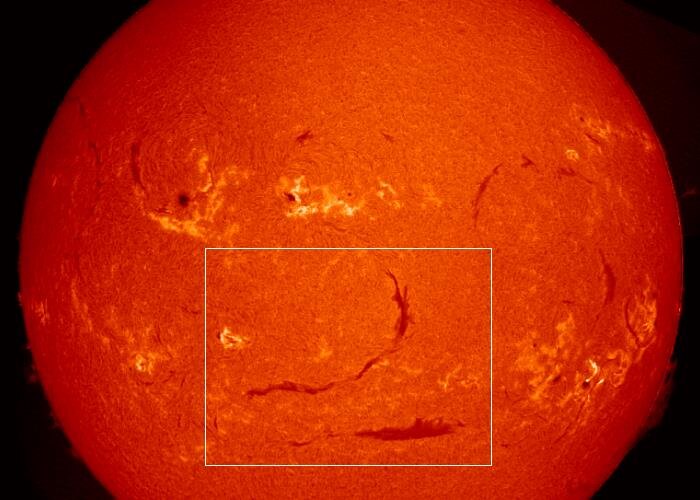 Солнце в спектральной линии водорода 2 ноября 2024 года Основным источником угроз для Земли в ближайшие 2-3 дня будут не X вспышки, а риск отрыва от Солнца гигантского протуберанца, сформированного сейчас в центре солнечного диска. На настоящий момент протуберанец выглядит как тёмное волокно, что связано с высокой плотностью его вещества, блокирующей поступающее снизу излучение Солнца. Размер волокна составляет более полумиллиона километров. Сам протуберанец висит как облако на высотах порядка 10 тысяч км над солнечной поверхностью. Именно высокие плотности, которые примерно в 100 раз превышают плотность окружающего газа, делают протуберанцы основными «накопителями» вещества в короне Солнца. Масса одного такого объекта может превышать массу всей оставшейся короны, что и определяет связанные с ними угрозы. В последнее время уже приходилось наблюдать отрыв гигантских протуберанцев на краю Солнца, откуда они улетали к другим планетам. На этот раз риски выставлены уже для Земли. Основным и