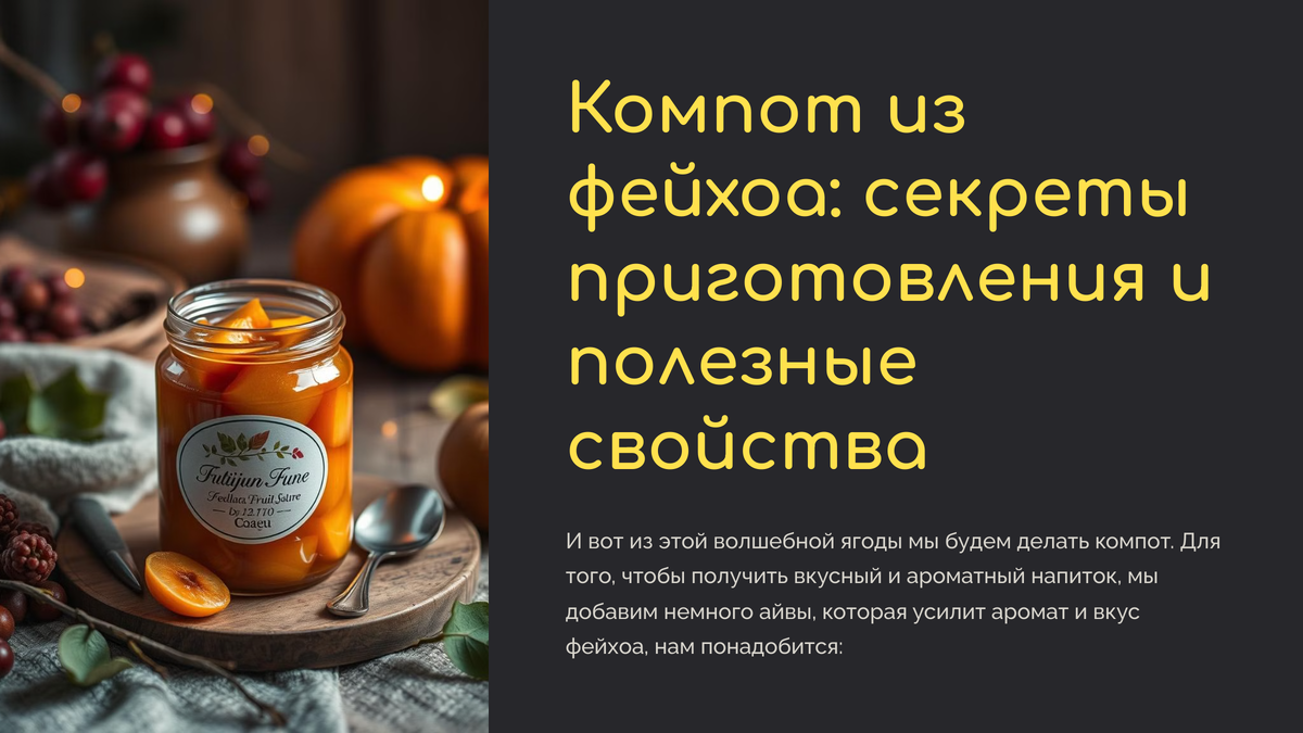 Вот и наступил последний месяц осени. Еще А. С. Пушкин писал об осени «Осенняя пора - очей очарованье....», последняя, самая вызывающая восхищение, улыбка года. И когда вечерами становится темно, а за окном приходят первые заморозки, очень хочется наполнить свою душу теплым, волшебным напитком. Например компот из фейхоа. Эта южная ягода как раз поспевает осенью. Спелые сочные плоды фейхоа имеют мягкую и сочную сердцевину. Мякоть кисло - сладкая, с клубнично - ананасовым привкусом. А еще фейхоа содержит природные антиоксиданты, которые обладают антибактериальными свойствами. В фейхоа содержится много витамином С, В, Р и Е. также в ягоде много полезных флаванолов - это вещества активизирующие работу кишечника, а еще он подходит тем, кто пытается нормализовать свой вес, за счет низкой калорийности.