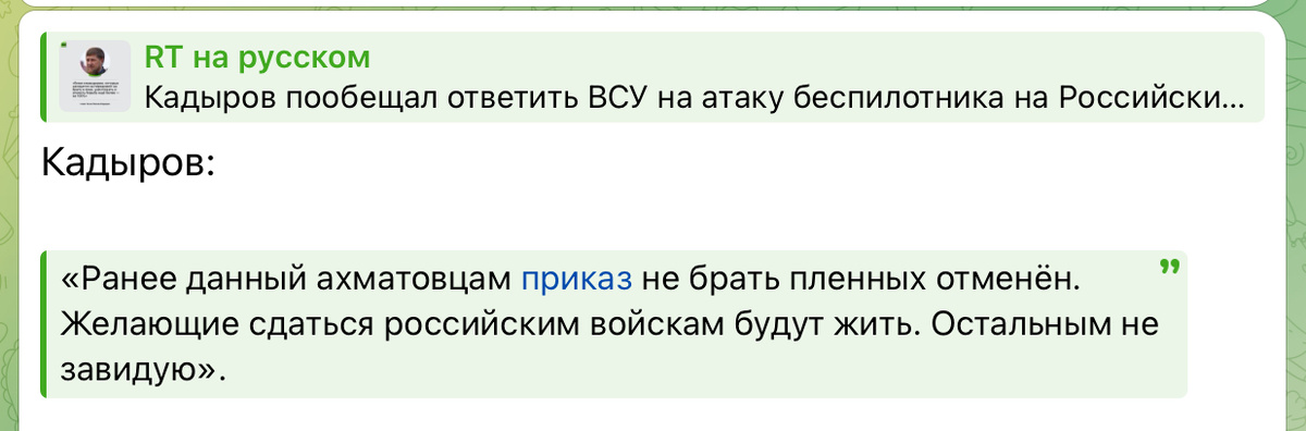 Пожалуй, Госправовед был единственным, кто осмелился прямо и публично сказать в Дзен, что приказ Р.А.Кадырова «пленных не брать» является незаконным. Об этом промолчали МИД, Генпрокуратура, Минобороны и даже Верховный Главнокомандующий. Но так или иначе право восторжествовало - Кадыров сам объявил об отмене своего приказа. Умение признавать свои юридические ошибки свидетельствует о силе и мудрости политика.