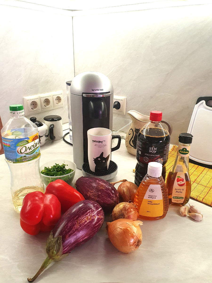 Речь сегодня пойдёт не о холодном, а о тёплом салате. Впрочем, это я его ем в тёплом виде, сразу после приготовления или разогреваю, а муж Любимый любит его в остывшем виде или холодным, - из холодильника. С удовольствием кладёт его сверху на хлебушек или заворачивает в лаваш, а мне он нравится в качестве самостоятельного тёплого гарнира к мясу или курице. Вкус у салата в тёплом и в холодном виде (действительно) чувствуется по-разному. А уж как вкуснее, - каждый сам решит. Обязательно приготовьте его, салат очень простой, состоит всего из трёх ингредиентов и заправки. Для салата берём: 2-3 баклажана, 1-2 болгарских перца, 2-3 луковицы. Почему нечёткое количество? Я беру произвольно соотношение овощей, но обязательно учитываю их размер. Если перцы крупные, то на два баклажана достаточно одного перца; также важно, крупные или мелкие у вас баклажаны и какого они сорта. У меня, в прошлую субботу были светлые баклажаны, они слаще, "мясистее" и меньше теряют в объёме при тепловой обработке