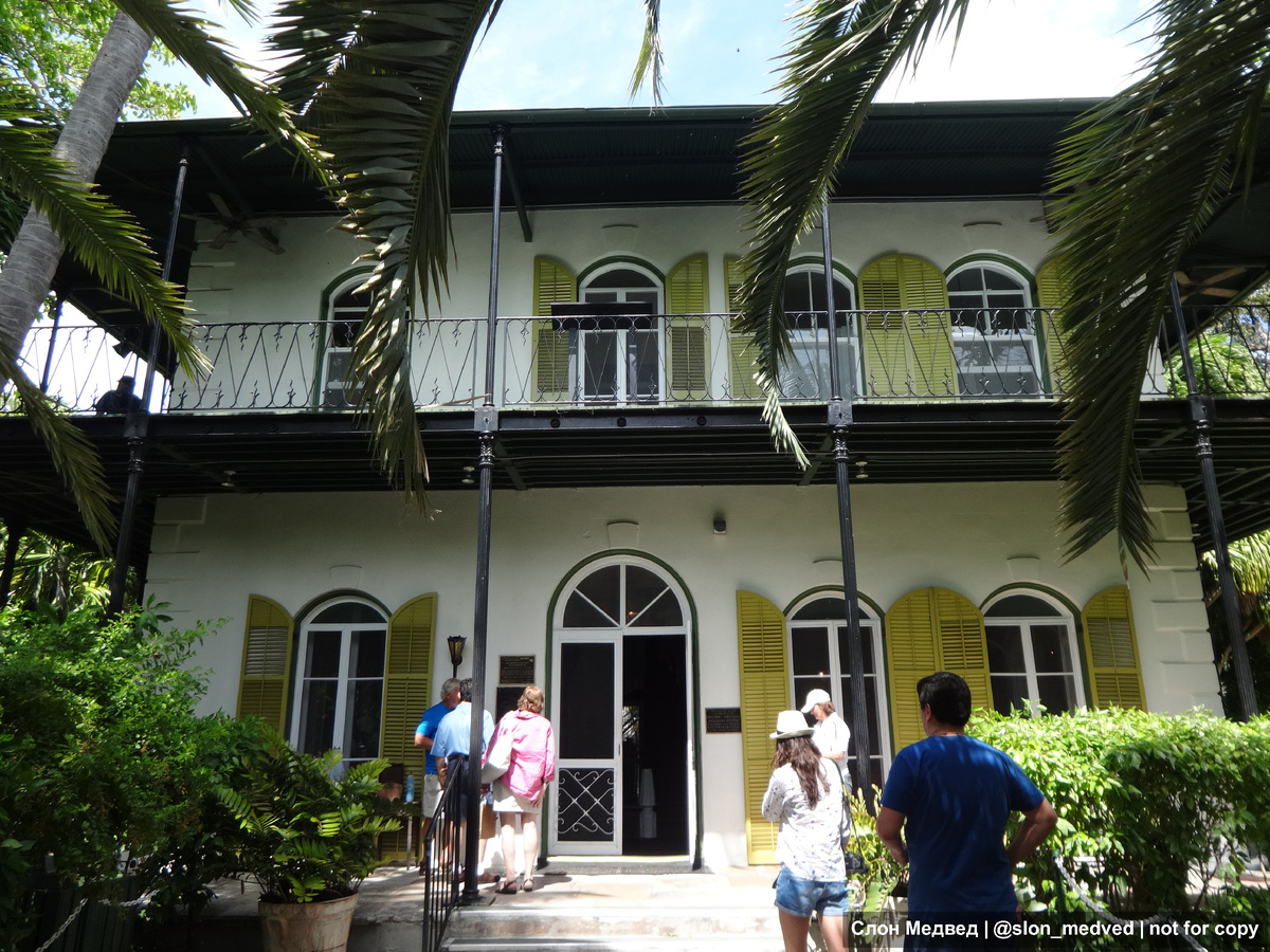 Приветствую своих читателей на страницах интернет-дайджеста про путешествия Слон Медвед. Сегодня команда нашего СМИ подготовила материал про дом-музей любимого многими писателя, Эрнеста Хемингуэя, который расположен в США, в городе Ки Уэст, недалеко от Майями, Флорида. При упоминании "музея Хемингуэя", основная масса людей сразу вспоминает усадьбу "Финка Вихия" (дом с башней) в Сан-Франсиско-де-Паула (Куба), вблизи Гаваны, где Хемингуэй жил и работал с 1939 по 1960 год. О нём мы расскажем как-нибудь в другой статье. Ну а сейчас покажем, как мы побывали в его американском доме, куда он переехал со своей беременной женой из Франции в 1931 году. Впрочем от Кубы этот дом находится совсем недалеко. На самолёте всего час полёта. Давайте же прогуляемся по территории дома, а потом зайдём внутрь. Дом семье Хемингуэеев подарил богатый дядя жены Эрнеста, Полин Пфайффер. И стоил он в то время 8000 долларов. Ремонта и многих построек тогда ещё не было. Полин его даже называла «проклятым домом с пр
