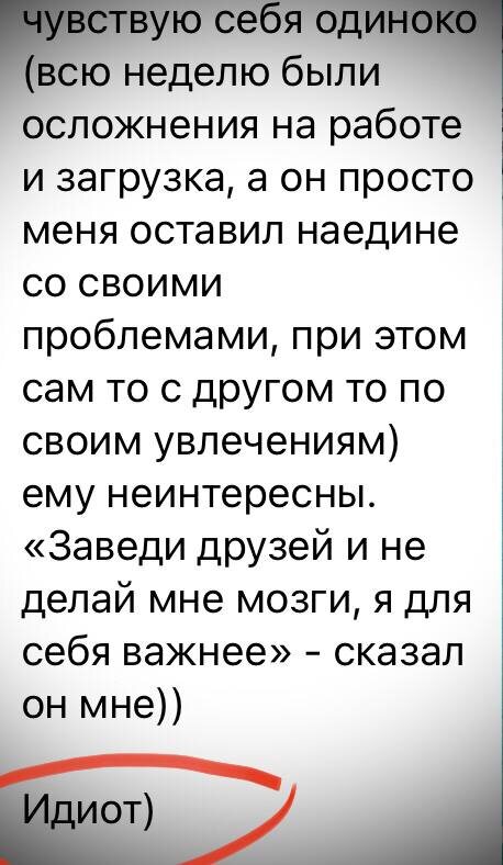 А вот у женщины любовь к себе как раз провалена, именно поэтому она себя так ведет. Ей бы быстренько ее поработать через этот комплекс Но вместо этого она выбирает называть мужчину идиотом и получать последствия.