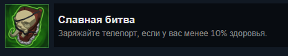 Сам предмет очень сильный, относится к зелёным (необычным) шмоткам. В оригинале наплечник называется «Glorious Battle». При убийстве 4 врагов за 1 секунду: Способ открытия: Нужно зарядить телепорт, имея меньше 10% здоровья. Проще всего открыть этот предмет на 1 этапе лёгкого режима, играя за Погрузчицу. Убейте боса и зарядите телепорт до отметки 98%. Когда она будет достигнута, выйдите из красного круга. Всех врагов не убивайте, дайте им себя раздамажить до нужной отметки 10% хп. После этого войдите вновь в круг. Ачивка с предметом не из простых, но я уверена, у вас всё получится!
