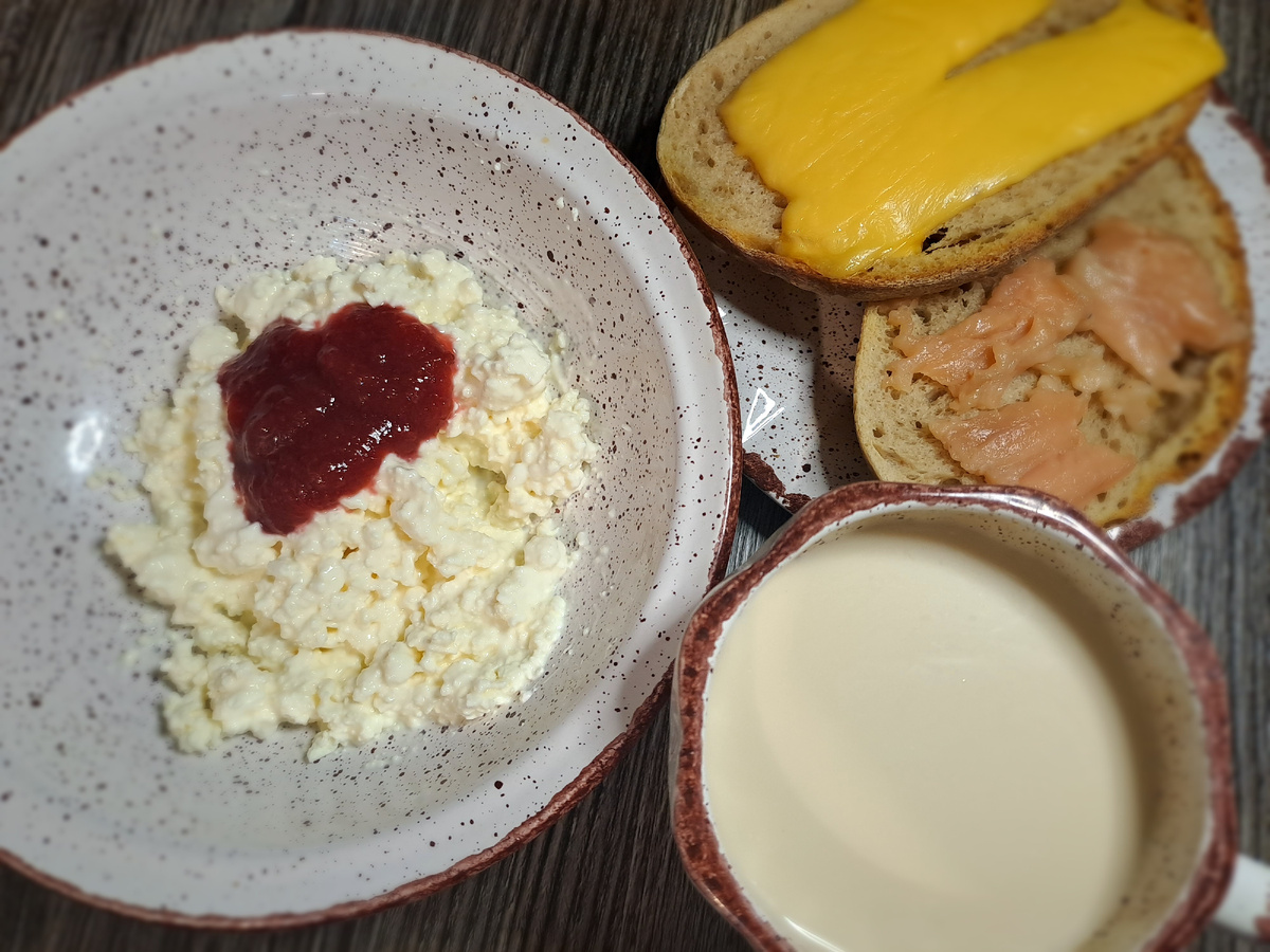 Завтракали творогом. В тарелки джем положила домашний. Горячий бутерброд с сыром и бутерброд с солёной форелью. Небольшой кусочек засолила вчера,сегодня ели,вкусно))