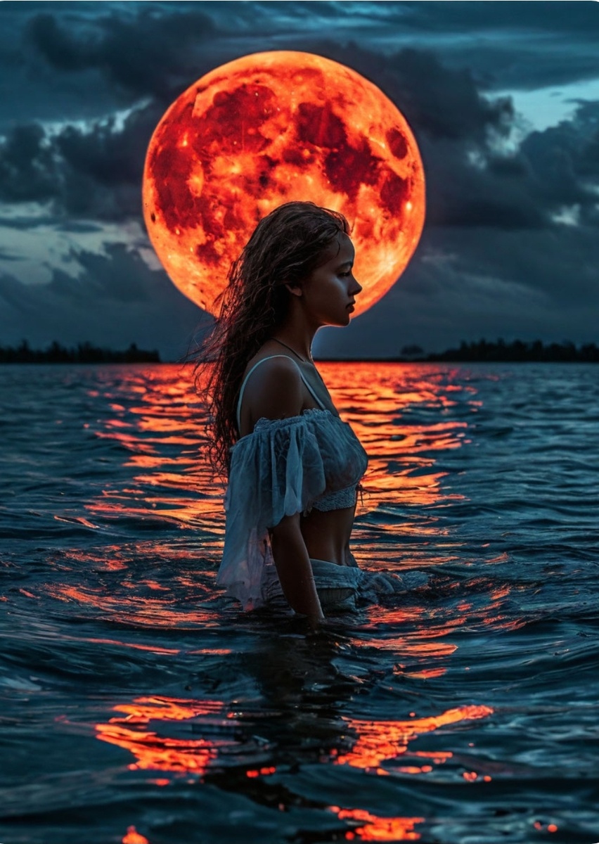 Та ночь запомнилась каждому жителю деревни на берегу озера. Луна, окрашенная в красный цвет, висела низко над водой, отражаясь в тёмных глубинах. Ветер шептался с листьями деревьев, создавая мелодию, которая могла бы показаться колыбельной, если бы не её тревожный оттенок. Внезапно вода озера зашевелилась, и из глубин поднялась фигура. Это была девушка, одетая в белоснежную начнушку, которая плотно облегала её стройное тело. Волосы, словно водопад, струились вниз, сверкая в лунном свете. Глаза её были наполнены глубокой мудростью, а взгляд проникал прямо в душу. Девушка медленно вышла на берег, ступая по земле, как по мягкому ковру. Её шаги не издавали ни звука, и казалось, что она парит над землёй. Жители деревни, собравшиеся на берегу, смотрели на неё с трепетом и восхищением. Никто не смел заговорить первым, опасаясь нарушить эту волшебную атмосферу. Наконец, старейшина деревни, дрожащим голосом, спросил: — Кто ты, дитя? Девушка ответила мягким, но уверенным голосом: — Я — ду