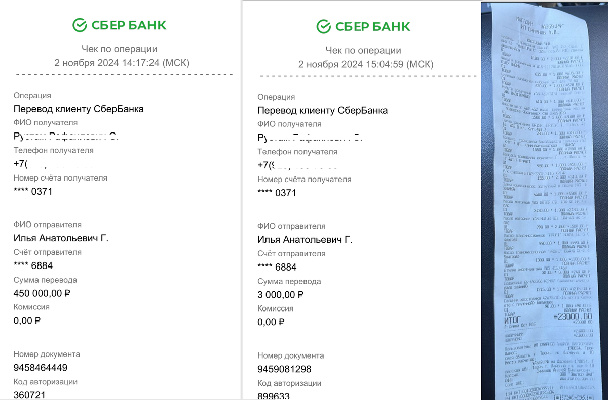 Докладываю. Сегодня утром перегнали УАЗ-Буханку с места стоянки до своего сервиса. Доехала Буханочка бодро. Наш механик провел диагностику. Вердикт - рама живая, двигатель рабочий. Вложения требуются, но при должном ремонте машина послужит, и хорошо послужит. После торга ударили с продавцом по рукам на 430 000 рублях. Но с тем условием, что я переведу ему 450 000 руб., а он на 20 000 рублей поставит нам запчасти бесплатно. Дело в том, что продавец является владельцем магазина автозапчастей УАЗ. Всего же запчастей и жидкостей на данный момент понадобилось на 23 000 рублей. В итоге доплатил еще 3 000 руб. Итого потрачено на машину и запчасти 453 000 руб. Вот скриншоты моих переводов и чек: Итого, с учетом всех предыдущих покупок, которые можно посмотреть в подборке автора "Акция №31", потрачено 2 611 085 руб. По состоянию на 18:30 час. по Москве 02.11.2024 г. сумма сбора по Акции №31 составляет 4 230 022,19 руб. Остаток на счете 1 618 937,19 руб. Из них вычитаем то, на что уже хватает: