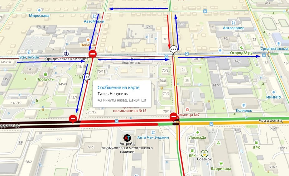 Выезд с улицы Потанина на Баррикад теперь стал тупиком, что приводит к значительным заторам на Напольной. Водители сообщают о том, что потоки машин, сливающиеся на Напольной, создают постоянные пробки, и проехать по этой улице стало крайне сложно.